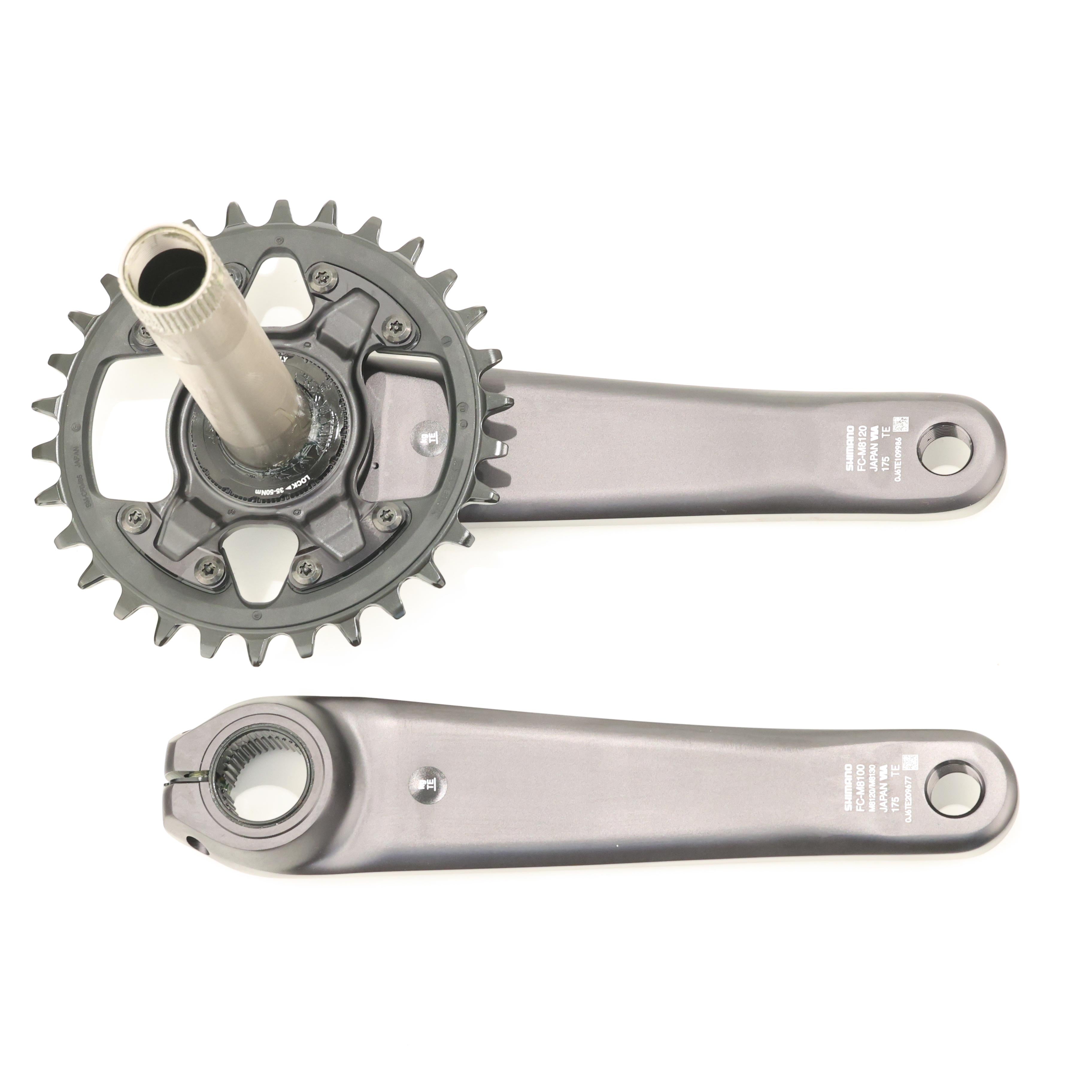 The Shimano XT FC-M8120-1 is a trail-ready crankset built for aggressive mountain riding. It uses a direct-mount 30T chainring and a 55mm chainline, ideal for Boost 141/148mm rear hub spacing. Shimano's proven Hollowtech II spindle design ensures a stiff and lightweight platform for optimal power transfer, while the forged aluminum construction boosts durability and trail performance.